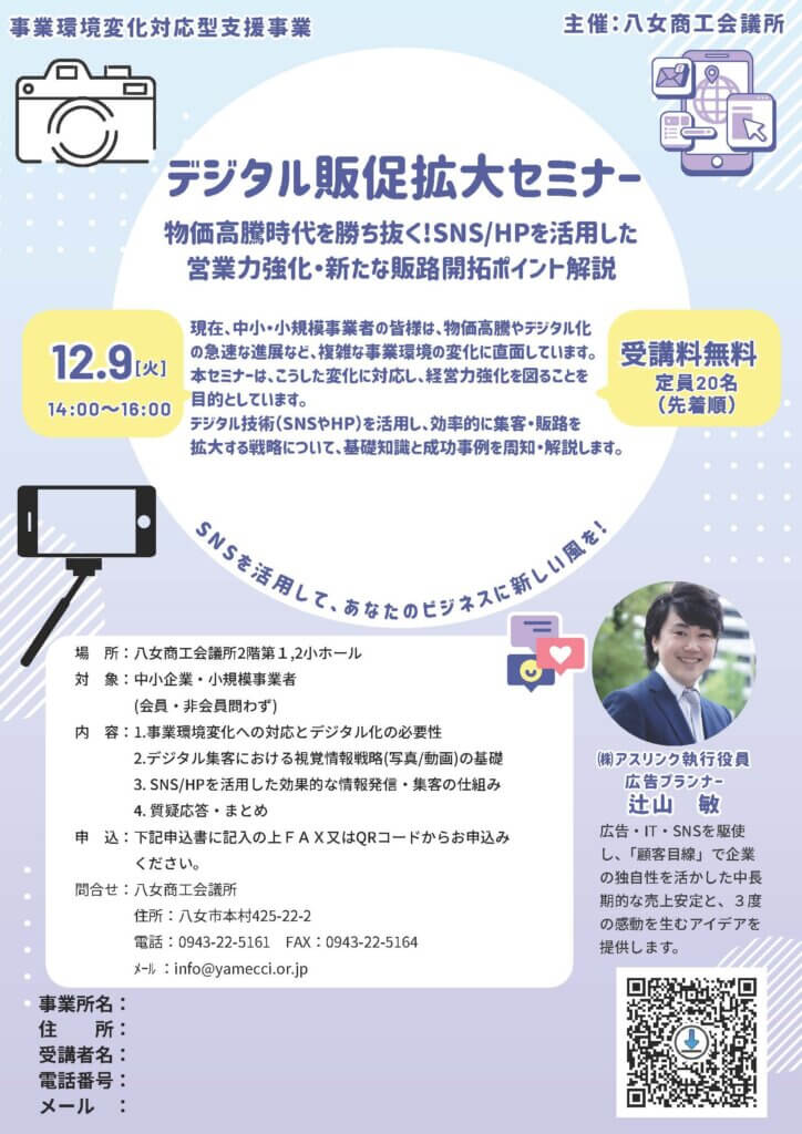 2025年12月9日に八女商工会議所様にてデジタル販促拡大セミナーが開催されます。