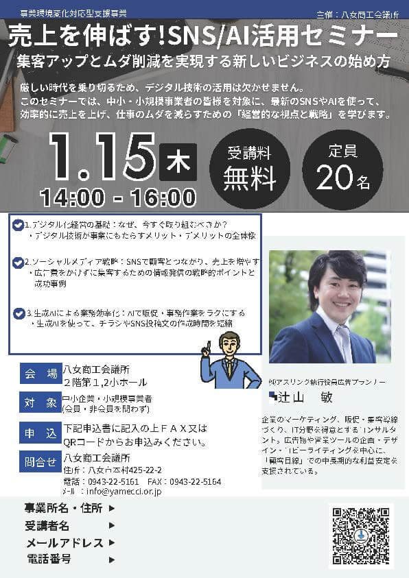 2026年1月15日に八女商工会議所様にて売上を伸ばす!SNS/AI活用セミナーが開催されます。